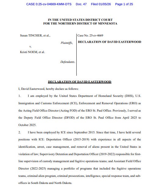 A court declaration filed by David Easterwood, a pastor at Cities Church in St. Paul, contains detailed background on enforcement and removal operations and DHS use of force policy. Protesters disrupted a Sunday service at the church Jan. 18 over Easterwood’s directing ICE enforcement efforts in the wake of the killing of Renee Good. To date, a federal probe into the protests has led to four of the protesters being arrested and charged, the latest being journalist-provocateur Don Lemon arrested today. At the same time, no arrests or investigation reports from federal agencies have been forthcoming in the deaths of Good and Pretti.